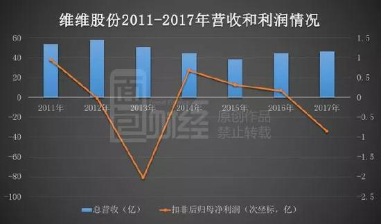 财报显示,2014-2017年,维维股份扣非后归母净利润连续三年下滑,至2017年,公司扣非后归母净利润亏损约0.86亿元。