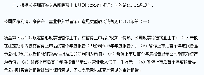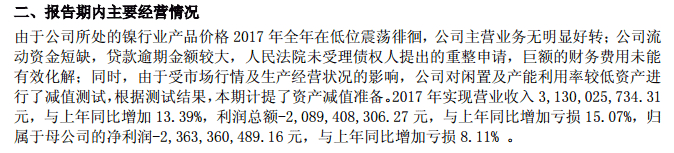 年报显示,2017年度亏损3.5亿元,期末净资产为负3822.1万元,同时触及了净利润和净资产两项终止上市情形。