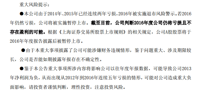 2017年3月21日,也就2016年年报发布前夕,公司突发公告,自曝公司过往涉嫌财务违规,存在存货不实、销售收入确认违规、费用少计、子公司“多套账”涂改票据等问题,第二天,公司收到了证监会立案调查通知。