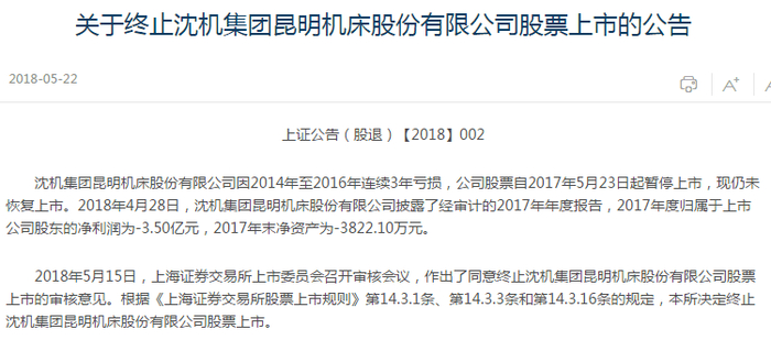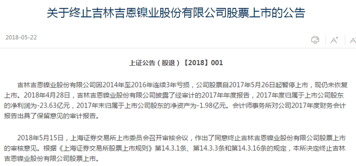 就在刚刚,2018年首批退市公司已确定!上交所5月22日宣布,对*ST吉恩和*ST昆机作出终止上市决定。也就是说,这两家公司摘牌没跑了。