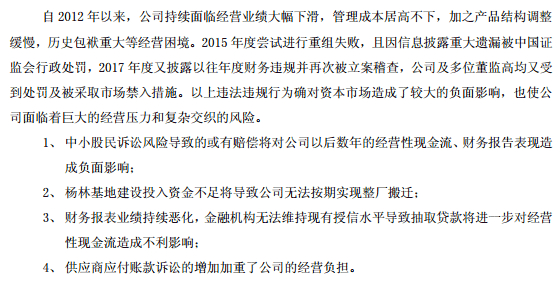 事实上,对财务造假的情况进行追溯重溯后,公司2012年至2017年连续六年亏损。证监会在查实相关事实后,对公司及有关责任人进行了行政处罚,上交所也相应给予了纪律处分。违法违规行为让公司在巨大经营压力之外又添风险。