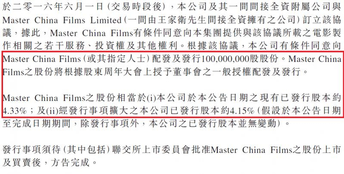 欢喜传媒此前分别向王家卫、陈可辛、顾长卫及张一白配发1亿股、1.445亿股、7500万股及1.4亿股新股,分别占公司扩大后已发行股份的3.92%、5.66%、2.71%及5.06%。