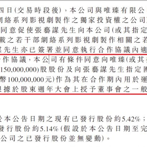 欢喜传媒公告显示,唯臻(或其指定公司)(一间拥有对张艺谋先生若干部网络系列影视剧制作之独家投资权之公司)占股欢喜传媒5.14%,这显然比乐视更有诚意。
