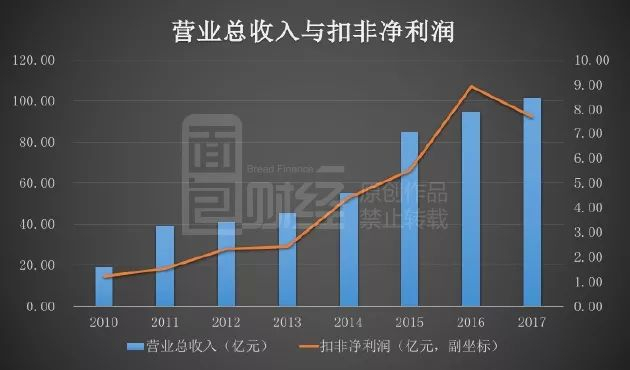 先交代一下万丰奥威2017年的业绩。公司的营业总收入突破了100亿,同比增长7.29%,但归母净利润与扣非净利润都出现了不同程度的下滑,较去年同期相比下滑分别为5.99%和13.6%,出现了增收不增利的情况。