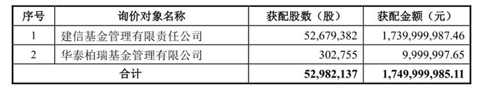 随后,万丰奥威在2015年12月30日非公开发行股票发行情况公告中称,公司共发行约5298万股,发行价格为33.03元/股,共募集基金总额约17.5亿元。此次非公开发行新增股份将于2015年12 月 31日在深圳证券交易所上市,且投资者认购的本次非公开发行股票自上市之日起 12 个月内不得转让。而本次非公开发行的对象仅有2名,最终确定的发行对象及获配情况如下: