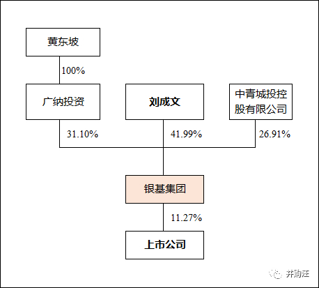 银基集团为*ST烯碳的控股股东,直接持有*ST烯碳11.27%股份(1.30亿股)。银基集团实际控制人为刘成文。银基集团转让前的股权结构如下图所示: