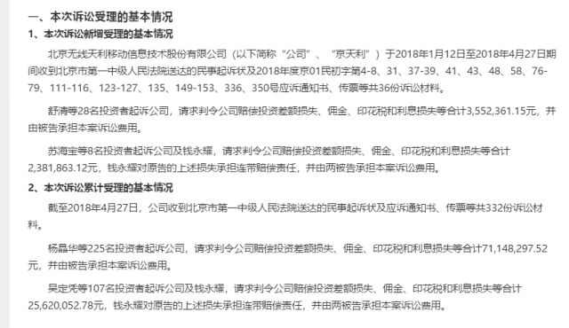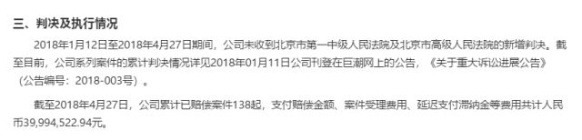 又如上市公司京天利4月28日发布公告称,截至2018年4月27日,公司累计已赔偿案件138起,支付赔偿金额、案件受理费用、延迟支付滞纳金等费用共计人民币39,994,522.94元。