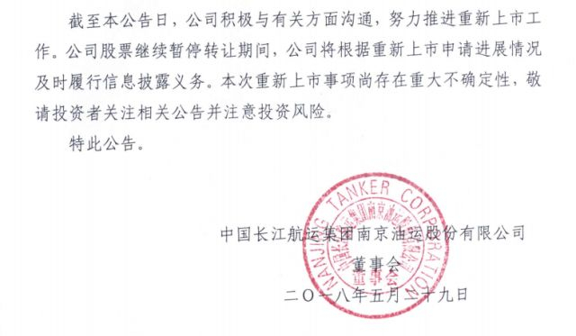 例如,被寄予重新上市厚望的“长油5”。2014年,原A股上市公司长航油运因连续亏损而退市,成为当时“央企退市第一股”。之后该股转入老三板挂牌,股票简称为“长油5”。