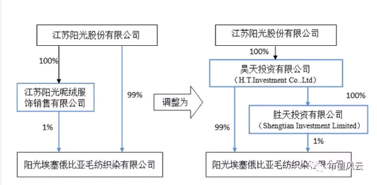 2016年12月,江苏阳光董事会通过了《关于调整设立阳光埃塞俄比亚毛纺织染有限公司出资主体的议案》,公司全资子公司昊天投资有限公司(注册地:开曼群岛)出资 99%,昊天投资有限公司全资子公司胜天投资有限公司(注册地:维尔京群岛)出资1%。