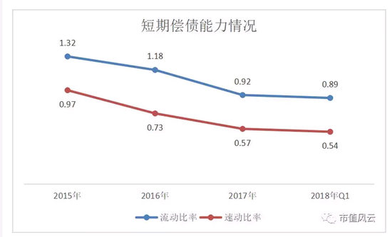江苏阳光的利息保障倍数从2016年达到最高点2.93以来逐渐下滑,2018年1季度已经下滑至近3年来最低点0.71,已经小于1,说明江苏阳光长期偿债也面临着一定压力。