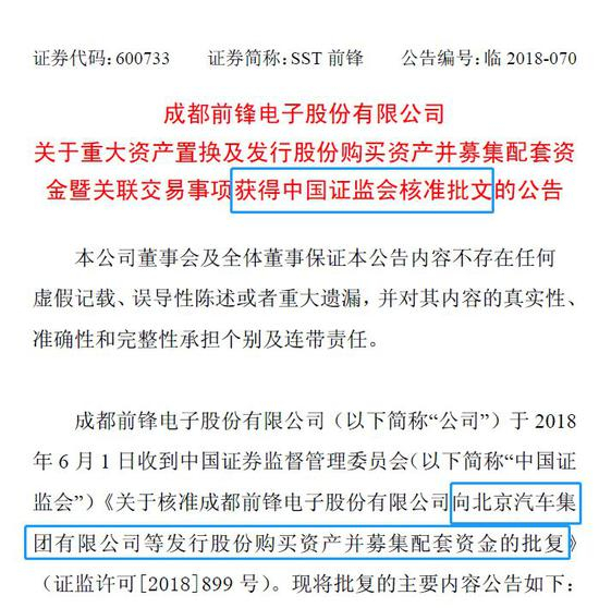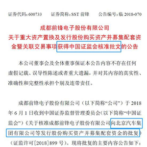 今晚,SST前锋发布重组及募套配资获批批文,中国证监会已经核准公司向北京汽车集团发行股份购买资产(北汽新能源汽车公司100%股权),以及募集配套资金20亿元。北汽新能源汽车作价288.5亿元注入上市公司SST前锋,SST前锋全部资产和负债作价1.87亿元置出,与北汽集团持有的北汽新能源股份中等值部分进行置换。