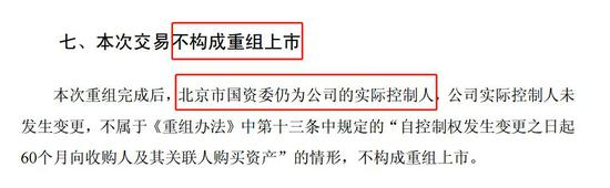 由于资产重组前后,实控人均为北京市国资委,因而本次交易不构成重组上市(借壳)。