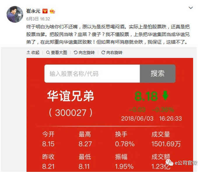 崔永元在微博中表示,终于明白为啥你们不还嘴,原以为是反思喝闷酒。实际上是怕股票跌,还真是把股票当爹。把股民当啥?韭菜?傻子?我不懂股票,上条把华谊集团当成华谊兄弟了,在此郑重向华谊集团致歉!但如果有坏消息就会跌,我保证,这错不了。
