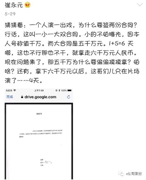 崔永元称某演员拍戏签一大一小两份合同,小合同约定片酬为人民币1000万元,大合同则为5000万元。且拿了6000万合同的该演员只在片场演了4天。其放出的合同图片显示,该演员为范冰冰。