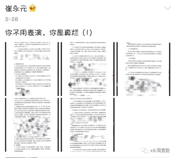 5月28日11:08,崔永元微博发布了几张演艺合同照片并配上文。合同截图中显示,范冰冰可获得1000万元片酬和不符合常理的条件,包括:范冰冰有权修改剧本且拒绝不满意的造型等。