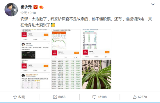 针对传媒股大跌,主人公小崔也表示:“安娜:太抱歉了,我家铲屎官不是故意的,他不懂股票。还有,谁能领我走,呆在他身边太紧张了😓 ”并配图华谊嘉信、华谊兄弟等大跌的图。