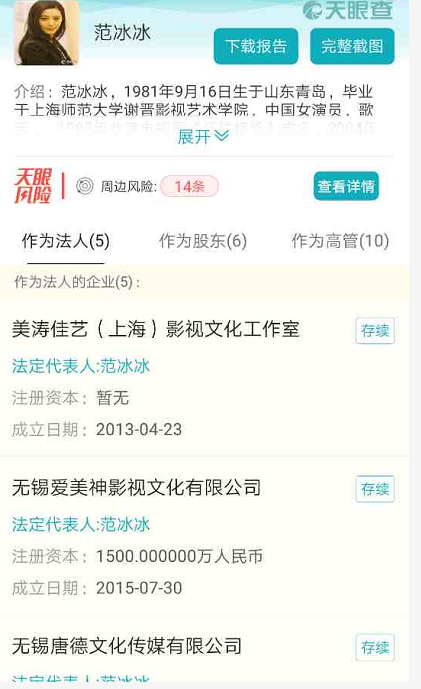 根据天眼查,范冰冰控股参股及与其相关的公司共有13家,其中有5家公司的法人是范冰冰本人,分别是2013年成立的美涛佳艺(上海)影视文化工作室,2014年成立的无锡美涛佳艺影视文化工作室,2015年成立的无锡爱美神影视文化有限公司,2016年成立的无锡唐德文化传媒有限公司以及2017年成立的北京美丽宫文化交流有限公司。