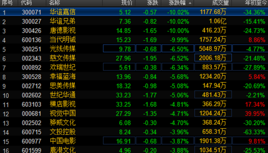 受次消息影响,今日早盘传媒股集体大跌。华谊兄弟开盘大跌9.66%,唐德影视大跌8.42%。截至午后14点,华谊嘉信跌停,华谊兄弟、唐德影视跌两位主角跌停,光线传媒跌6.5%,慈文传媒跌6.52%。其他传媒股也受其冲击,大跌走低。