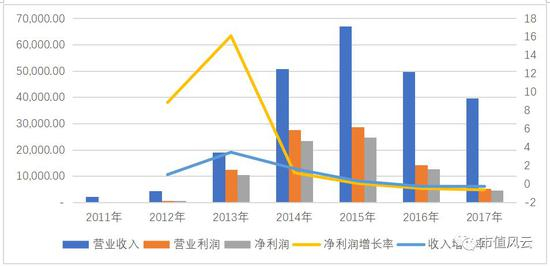 尤其2013年及2014年公司利润增长率一度达到179.65%及53.66%,也就是说2013年利润水平直接为2012年度的2.79倍,而2014年再次基础上又增长了近一倍,这增长速度,风云君看了也是激动。而2015年后公司业绩却直接呈现了负数增长,2016年净利润较上年下降18.41%,2017年则继续下降0.69%。