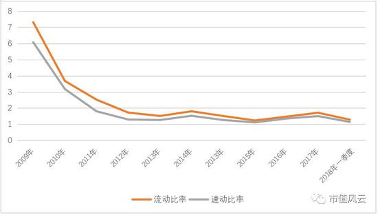 上市以来,公司流动比率及速动比率不断降低,流动比率由2009年的7.32降低至2018年一季度的1.28,速动比率趋势与之相同,从6.08降低至1.14,而截止至2018年一季度流动比率行业均值为2.10,速动比率行业均值为1.78,公司短期偿债风险还是比较高的。