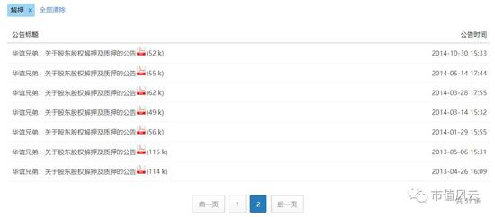 另外,浏览公司公告过程中风云君发现公司基本每次股权解押的同时都对应着重新质押,为此,风云君将“解押”关键字,对华谊兄弟上市以来的公告进行搜索,共出现37条公告,无一例外的是,所有股权解押的同时都对应着再度质押的公告,如图所示: