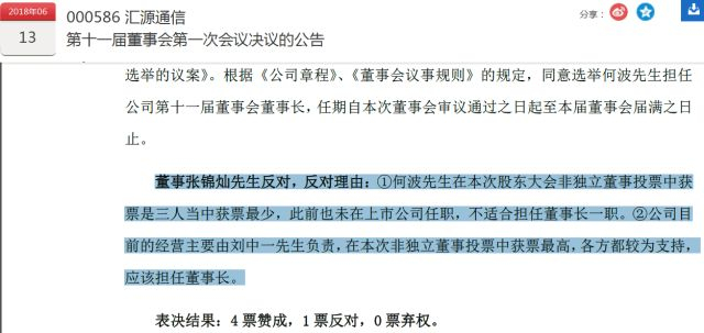 汇源通信6月13日还公告了一个插曲。6月12日,公司董事会选举何波担任上市公司董事长,但杨宁恩推选的董事张锦灿投出反对票。