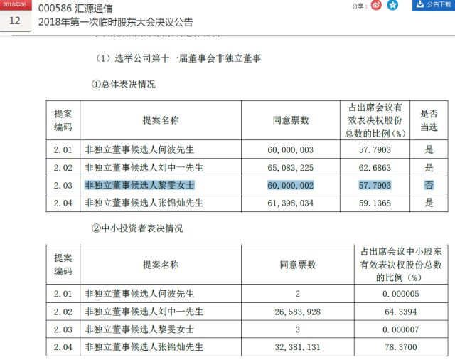 明细分析来看,在非独立董事选举表决上(四选三),“汇垠系”为使其推举的何波、黎雯当选,将1.2亿股平均分成两份分别投给了何波、黎雯。