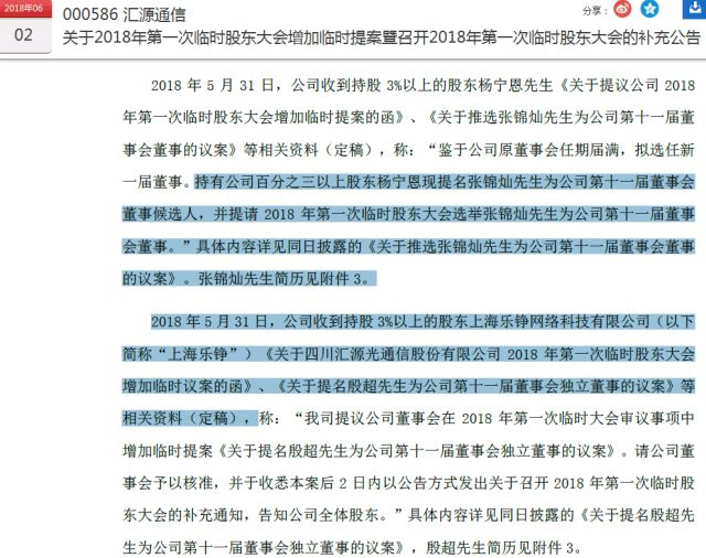 同一天,上海乐铮也临时提名殷超为汇源通信董事会独董候选人。两项提名看似突然,但事后来看双方皆是有备而来,其核心目的是制衡“汇垠系”。