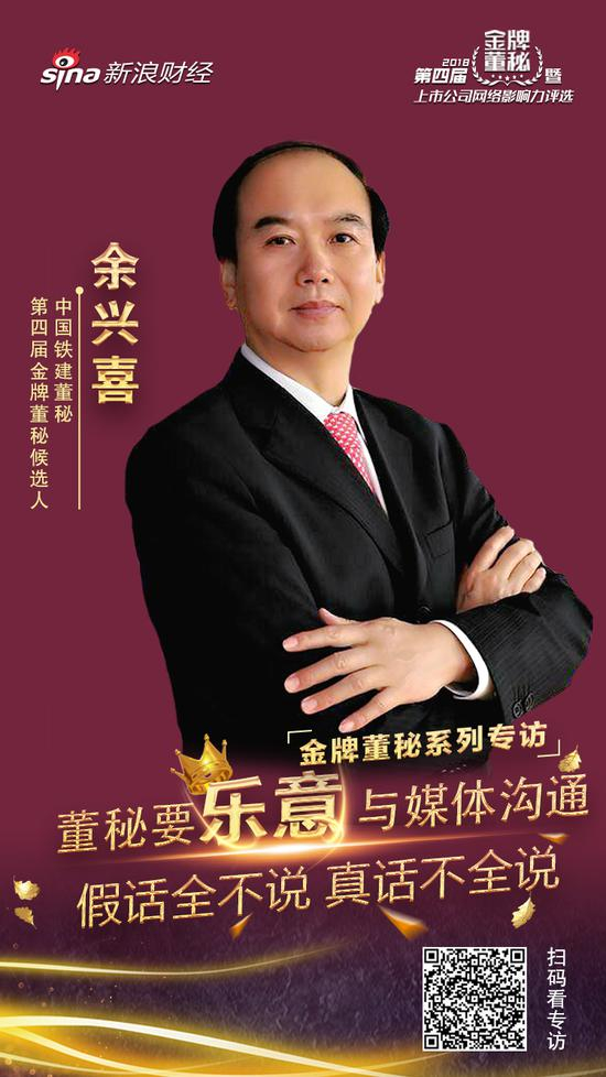 新浪财经主办的2018(第四届)金牌董秘网络票选于6月11日正式启动。本次金牌董秘网络票选时间为6月11日-6月27日。评选期间,新浪财经将举办“董秘专访”活动,近距离接触董秘圈,深度展现一幕幕与董秘相关的故事。本期,新浪财经带您走近中国铁建董秘余兴喜先生。