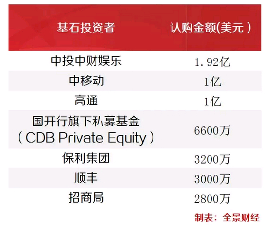 其中,包括中投中财娱乐认购1.92亿美元、中国移动认购1亿美元、高通认购1亿美元、国开行旗下私募股权认购6600万美元,保利集团认购3200万美元,顺丰集团认购3000万美元,招商集团认购2800万美元,7位基石投资者共计投资5.48亿美元。