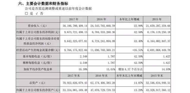 2018年4月28日,五粮液公开了2017年年报,实现营业收入约为301.87亿元,同比增长22.99%;归属于上市公司股东净利润约为96.74亿元,相较于2016年的67.85亿元,增幅为42.58%,营收与净利继续保持稳健增长态势。