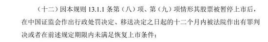 根据《深圳证券交易所创业板股票上市规则》(2018 年修订)第 13.1.1 条第(八)项规定:“上市公司因欺诈发行受到中国证监会行政处罚,或者因涉嫌欺诈发行罪被依法移送公安机关的,深圳证券交易所可以决定暂停其股票上市”。