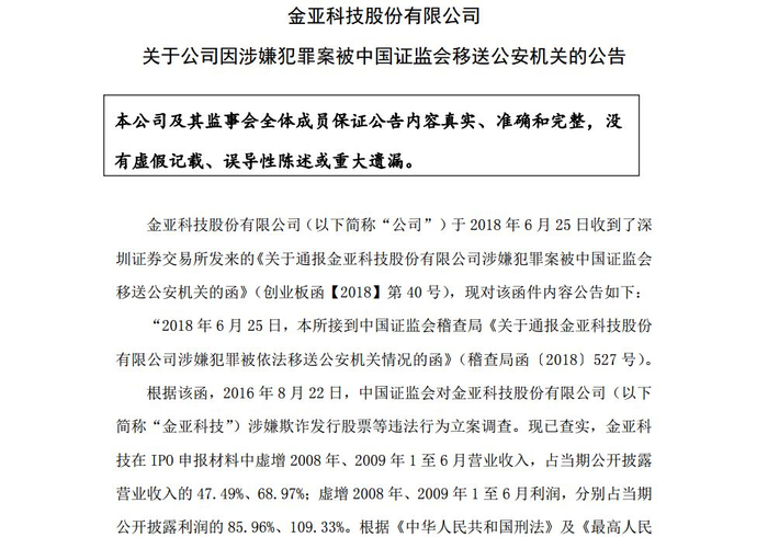 金亚科技欺诈上市东窗事发 将成下一个欣泰电气?