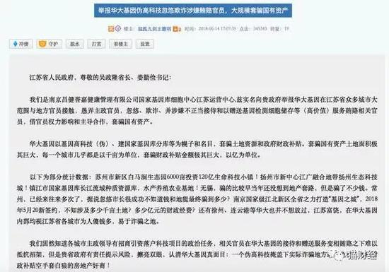 6月14日,天涯论坛注册用户“独孤九剑王德明”发布了一则《举报华大基因伪高科技忽悠欺诈涉嫌贿赂官员,大规模套骗国有资产》的文章,向江苏省人民政府举报华大基因在江苏省众多城市大范围与地方官员接触,愚弄主政官员,忽悠、欺诈、并涉嫌不正当接待和以赠送基因检测细胞储存服务贿赂相关官员,借官员权力影响和主导合作,套取国有资产等。
