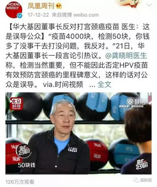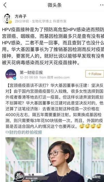 不过此事倒引来了方舟子的怒怼,其直言:“HPV疫苗接种是为了预防高危型HPV感染进而预防宫颈癌、咽喉癌,而基因检测最多只是查有没有被HPV感染,二者不是一回事,而且查到了也没什么用。华大基因董事长为了推销基因检测而反对疫苗接种,要害死人的。就好比说以能够早发现有没有被天花病毒感染而反对天花疫苗接种。”