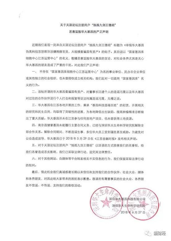 6月27日早间,华大基因方面针对上述网络“举报”发布声明。华大基因表示,并未在江苏参与任何房地产项目,也未曾获得土地资源。文中提到的华大基因套骗国有资产、对董事长汪建个人的造谣污蔑以及华大基因对过往的合作伙伴进行个人打击和报复一说纯属无稽之谈、恶意诽谤。此外,华大基因还表示,公司已采取法律行动,追究“独孤九剑王德明”法律责任。