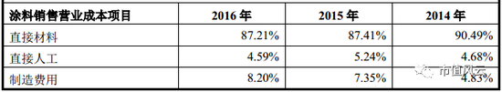 飞鹿股份主要的原材料为树脂、溶防水涂料专用材料、颜料、填料、助剂等,直接材料占营业成本比例最高,约90%左右。