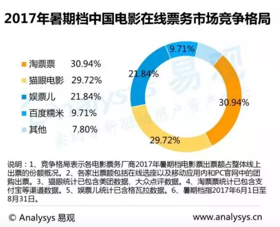 与猫眼淘票票全力进军暑期档不同,那些二线的票务平台们几乎销声匿迹,根据2017年易观公布的暑期档数据,当时的市场前四名分别是淘票票30.94%、猫眼29.72%、娱票儿21.84%、百度糯米9.71%。