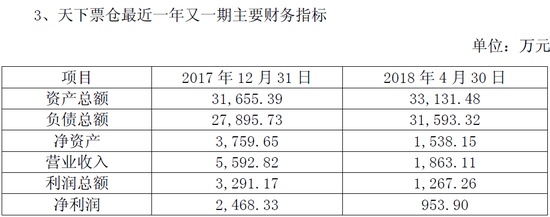根据这次转让公布的资料,2017年、2018年1-4月份天下票仓营业收入为5592.82万元、1863.11万元,同期的净利润分别为2468.33万元和953.9万元。
