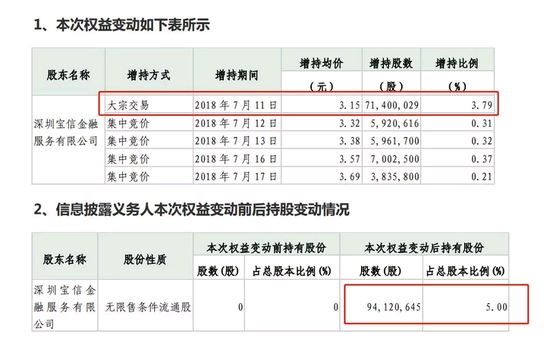 资料显示,深圳宝信先是7月11日通过大宗交易买入7140万股,占比3.79%;而7月11日当天刚好发生两笔大宗交易,一笔为3591.81万股,一笔为3548.2万股,两笔合计刚好为7140万股。