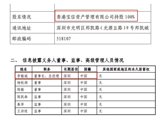 公告仅显示,深圳宝信为香港宝信资产管理有限公司100%持股,高管中董事长为李敏斌。