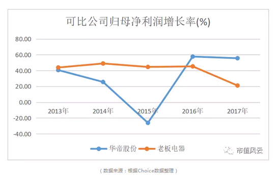 华帝股份与老板电器的归母净利润增长率跟营收的增长率大体上趋势类同,2016年开始,华帝股份就已经超越老板电器,可见,从归母净利润增长率来说,华帝股份的成长能力也优于老板电器。