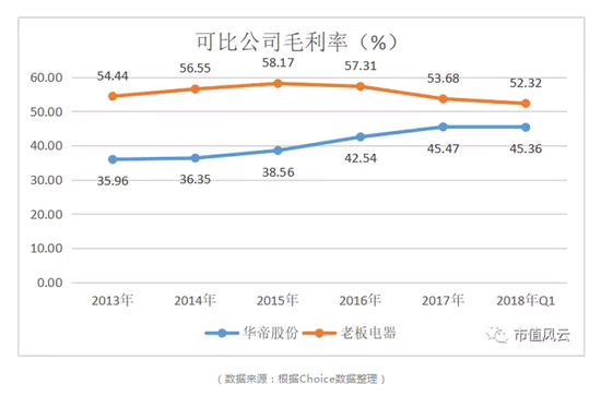 从图中可以看到,老板电器的历年毛利率明显高于华帝股份,可见其产品中更具有竞争力,但老板电器最近3年来毛利率逐步走低,而华帝股份呈缓慢爬升趋势,逐渐追赶并与老板电器的差距越来越小,说明华帝股份的产品竞争力逐渐走强。