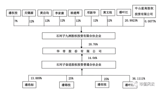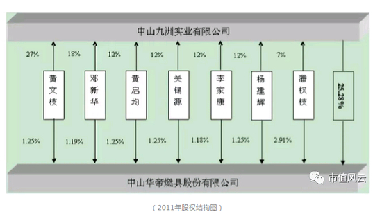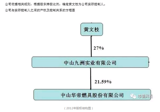 上市以来,华帝股份的实际控制人一直都是7位创始人。直到2012年,根据股东持股比例,7位创始人中的黄文枝成为唯一实际控制人。