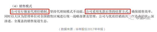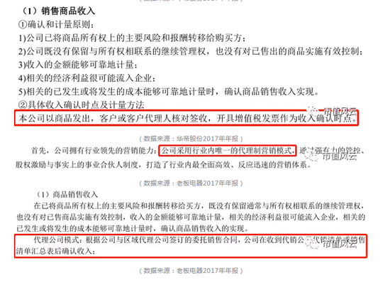 华帝股份主要采取的销售模式是独家代理经销制,以商品发出,客户或客户代理人核对签收,开具增值税发票作为收入确认时点。也就是说,只要是公司发了货,开了票,经销商签了收,OK,不用管这批货有没有最终到消费者手里,就可以确认收入了。