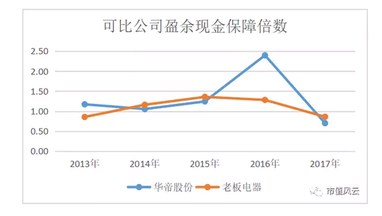 华帝股份的盈余现金保障倍数波动较大,2017年较2016年急剧下降,已经低于老板电器,而两家公司的盈利质量都在下降。