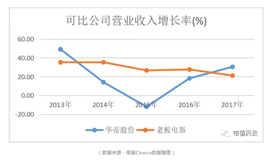 华帝股份的营业收入增长率波动比较大,先降后升,而老板电器总体来说波动较小,总体上逐渐下降,2017年华帝股份的营业收入增长率已经赶超老板电器,近年来的成长性相对较好。