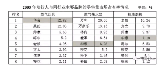 华帝股份在上市前一年战功赫赫。根据国家统计局中国行业企业信息发布中心统计显示,2003年,燃气灶具、热水器、抽油烟机三大品牌产品在全国市场同类产品中的销量分别为第一名、第五名、第四名。