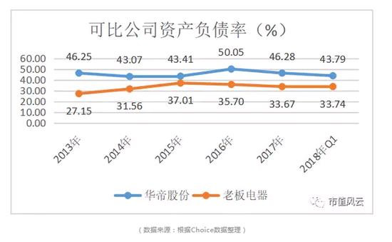 华帝股份的资产负债率虽然近3年有所下降,但总体上还是高于老板电器,偿债能力不如后者,后者对债务的偿付能力显得更强些。