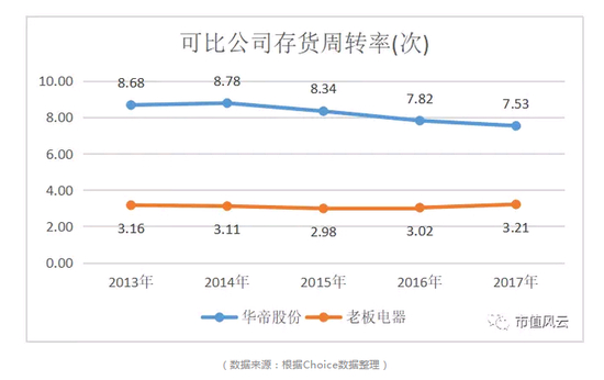 不同的销售模式,对上市公司的存货造成影响,从这方面来说,华帝股份的存货周转率即便是后者的两倍多,但并不一定真正的比后者优异。